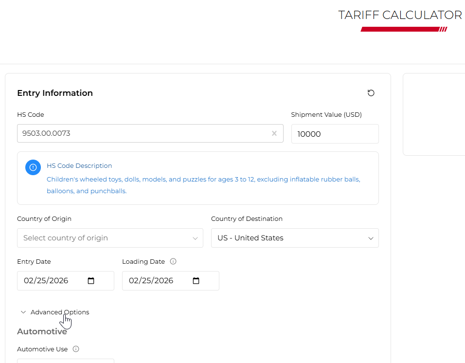 A: The Tariff Calculator reflects officially published and enacted tariff measures, generally updated within 48 hours of a formal regulatory announcement. Future entry dates will only reflect new tariffs once the underlying regulation has been finalized and incorporated.
