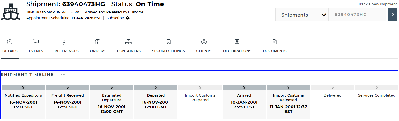 For example, if the shipment was received in Singapore, it would show as Singapore time, and when the shipment clears customs in Norfolk, VA, that timestamp would show in Eastern Standard time. See Shipment Timeline image below.